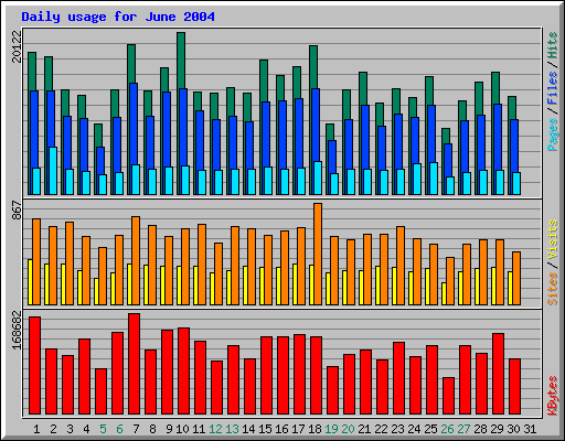 | Day | Hits | Files | Pages | Visits | Sites | KBytes | ||||||